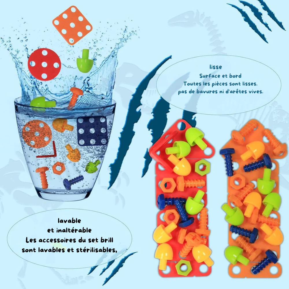 Grâce à une sélection de pièces colorées et robustes, ainsi qu'à une perceuse électrique conçue spécialement pour les enfants, les jeunes peuvent s'adonner au vissage et au dévissage, développant ainsi leurs capacités motrices tout en approfondissant leur compréhension du monde technique.