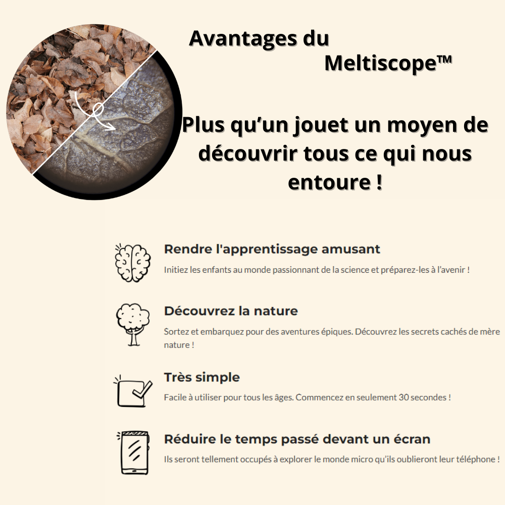 Le Meltiscope™️ éveille la curiosité et stimule l'imagination de vos enfants ! Faites leur Découvrir des insectes, des feuilles et même des minéraux de près.