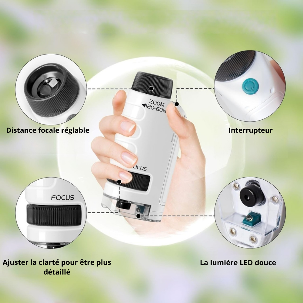 Avec sa petite taille et son design amusant, ce microscope de poche rend l'exploration scientifique facile et amusante pour les enfants alors, ne manquez pas cette occasion de découvrir le monde avec votre mini microscope !